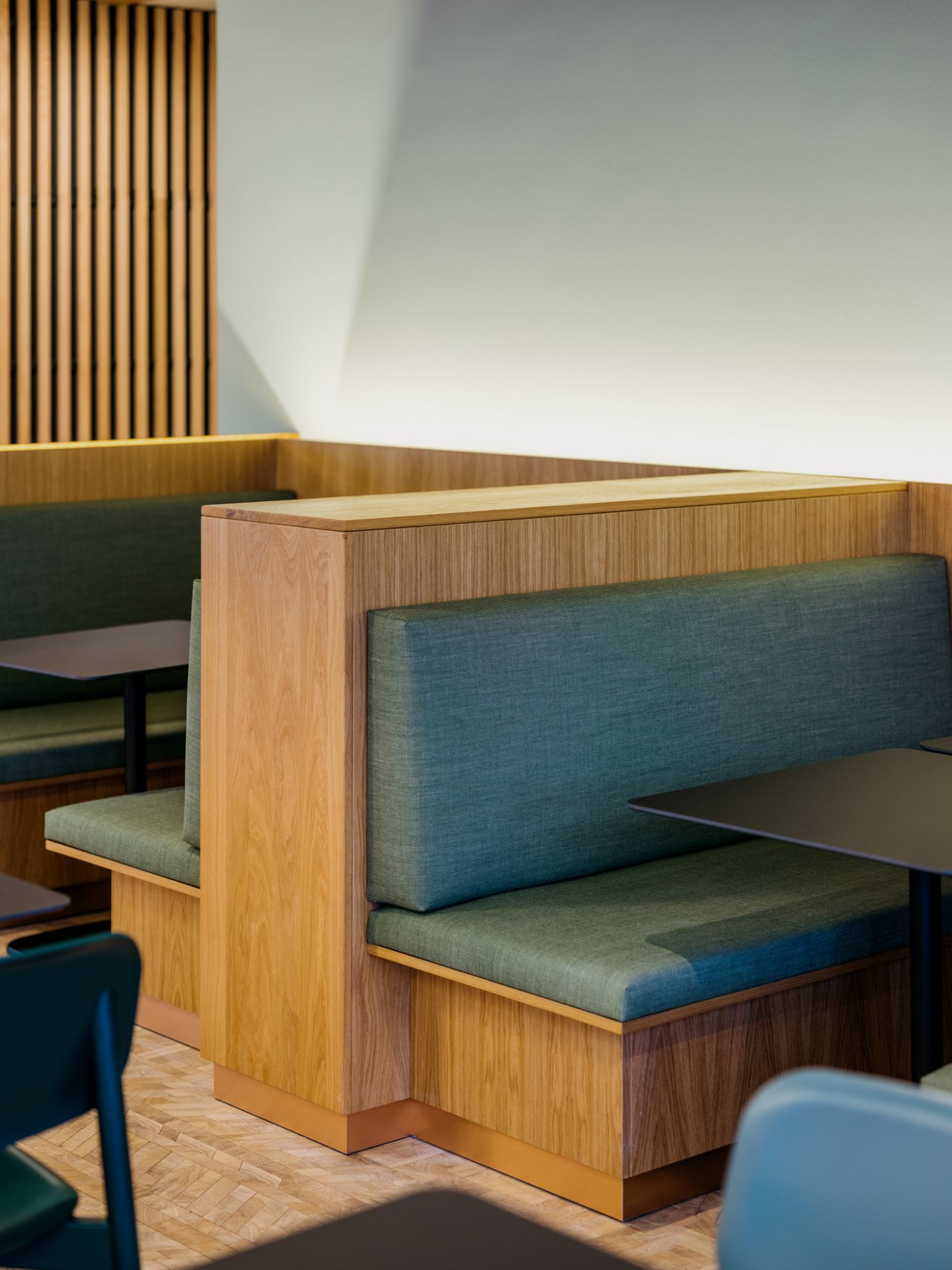 Vue d'ensemble de la salle de restaurant. Un travail spécifique a été réalisé autour de la matérialité de l'espace affin d'offrir un lieu chaleureux et convivial