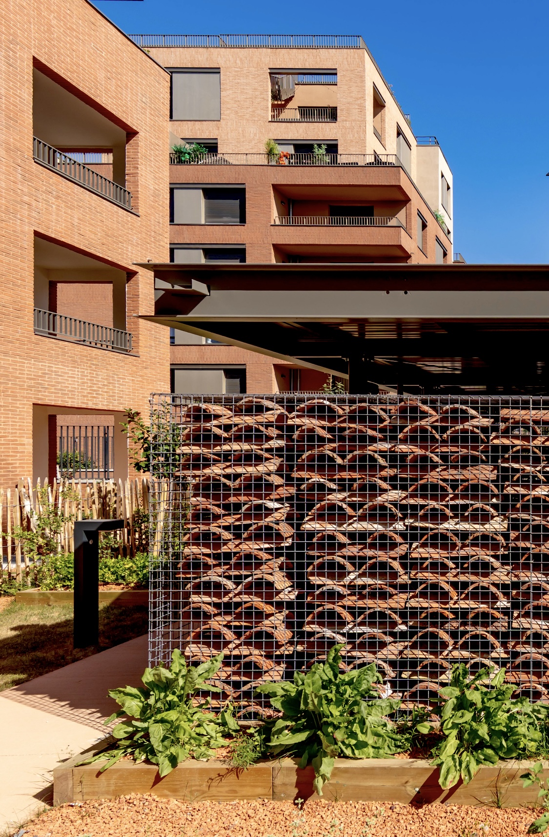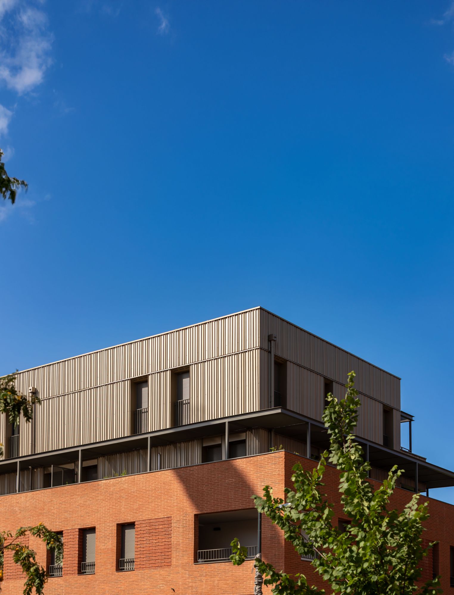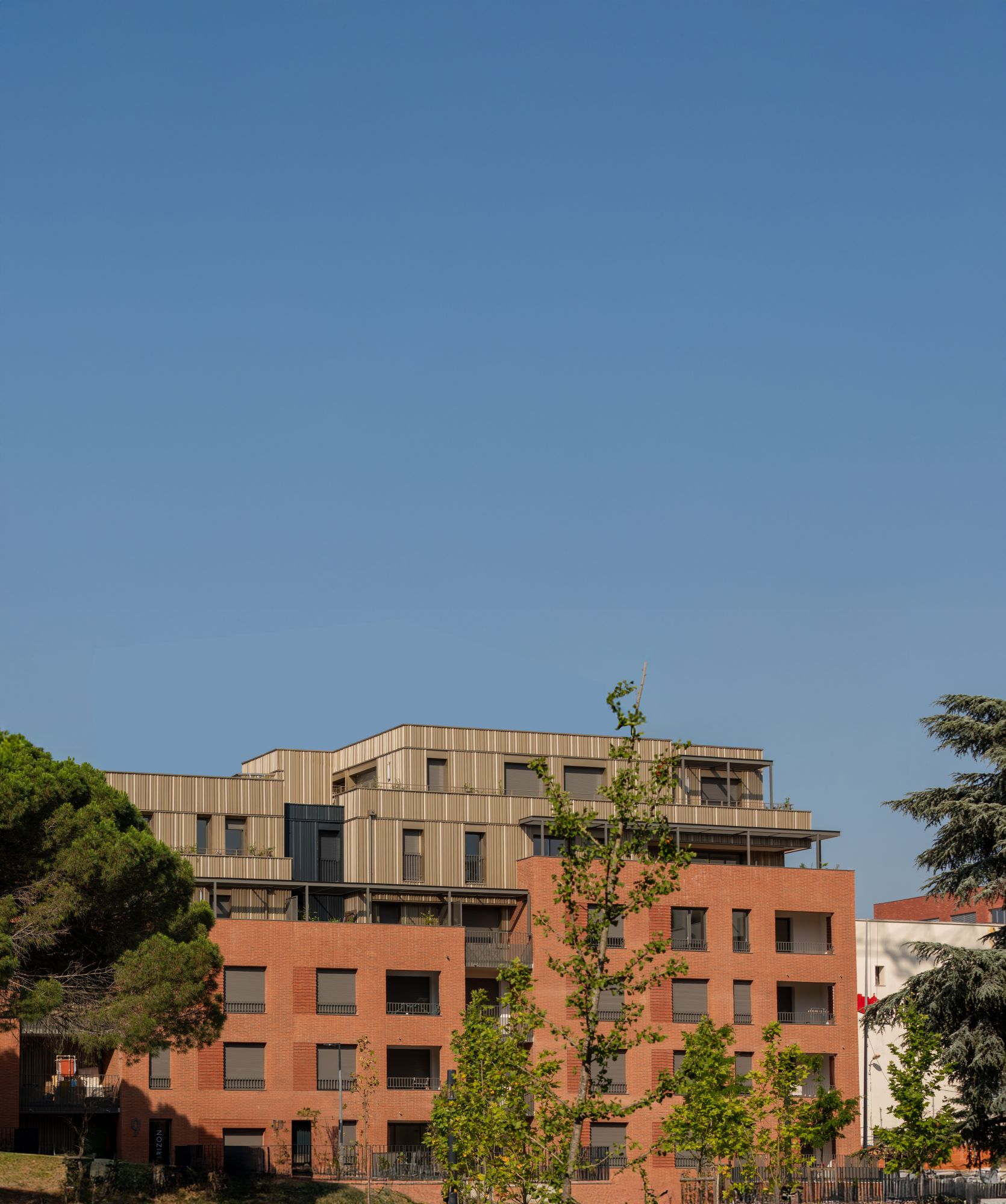 Chaque logement bénéficie d’espaces extérieurs généreux. Le socle dont la massivité est exprimée par la brique trouve