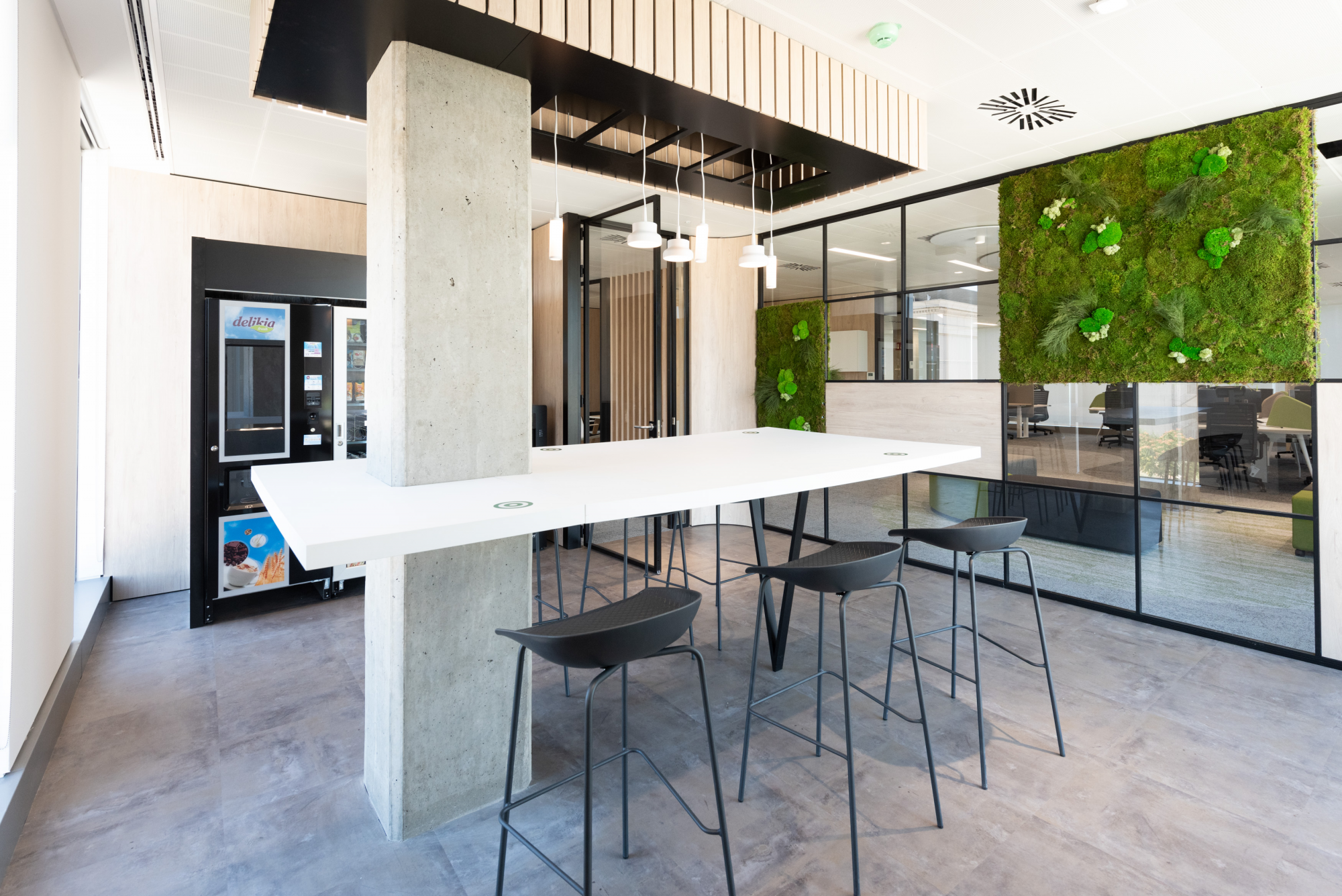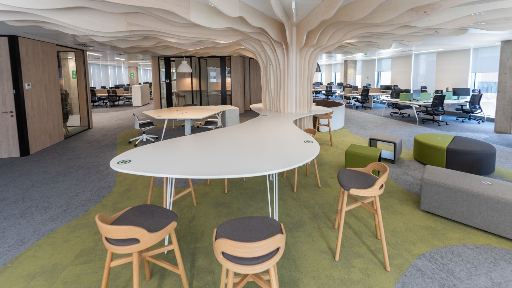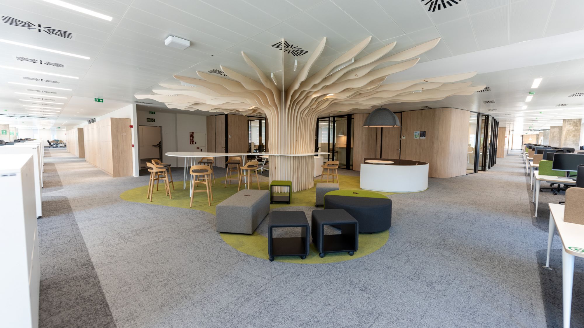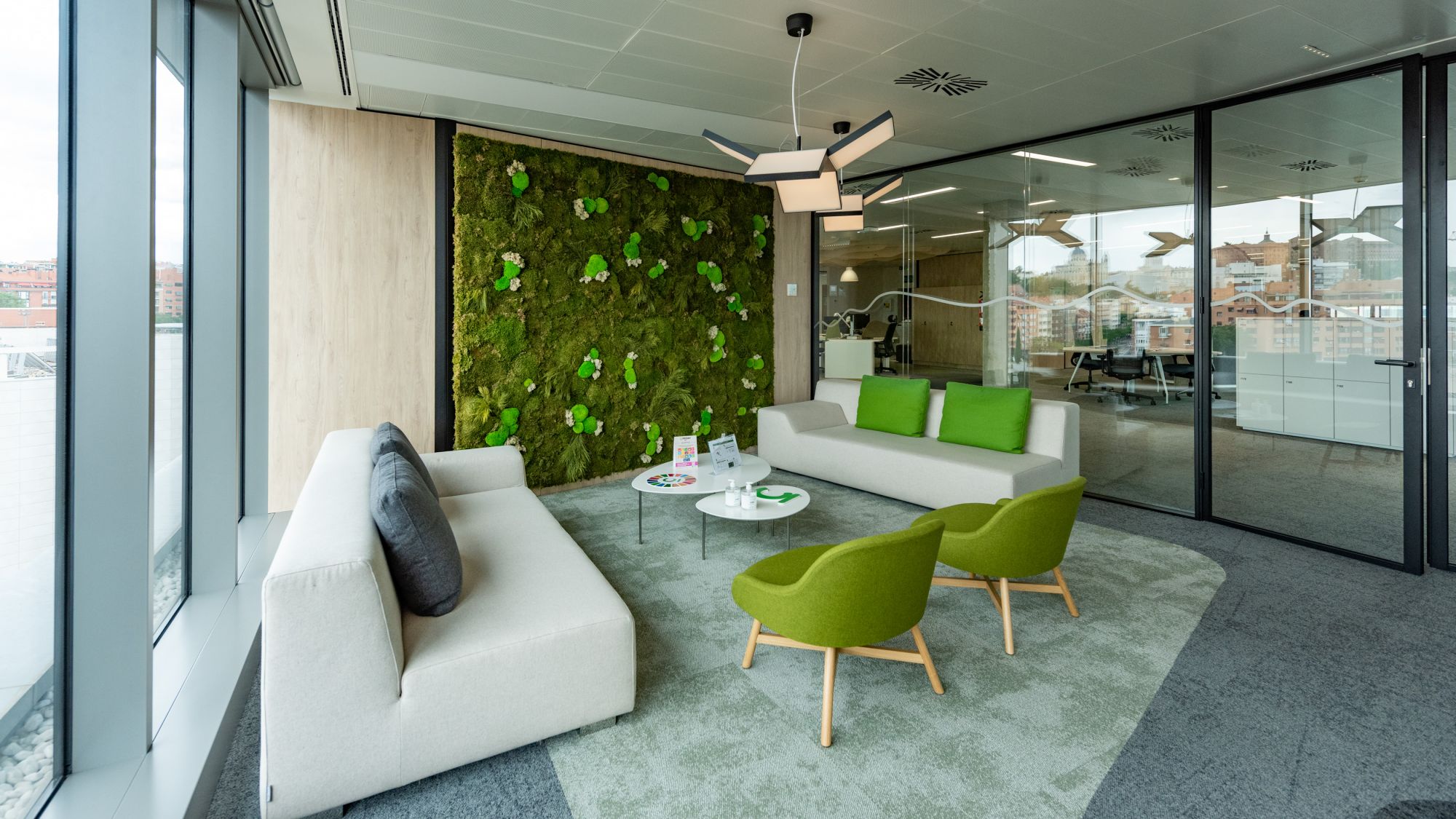 Además de los amplios y luminosos espacios de trabajo, la nueva sede cuenta con salas de colaboración inspiradas en ambientes confortables, naturales y hogareños, transformando la oficina en un entorno tranquilo, inspirador y saludable. A ello contribuyen espacios como “el ágora” con una gran mesa de trabajo bajo un “árbol” en medio de la oficina, plantas liofilizadas, la cafetería de trabajo y el restaurante, abierto también a la comunidad y la zona de bienestar (espacios médicos y de enfermería). Otros entornos dinámicos, como salones, cabinas telefónicas, salas de reuniones, formación y auditorio, también son accesibles a la comunidad. Los materiales, como la madera, los tonos tierra y el verde de la vegetación, han desempeñado un papel esencial en el proyecto, haciendo de la sede un entorno de trabajo único e innovador.