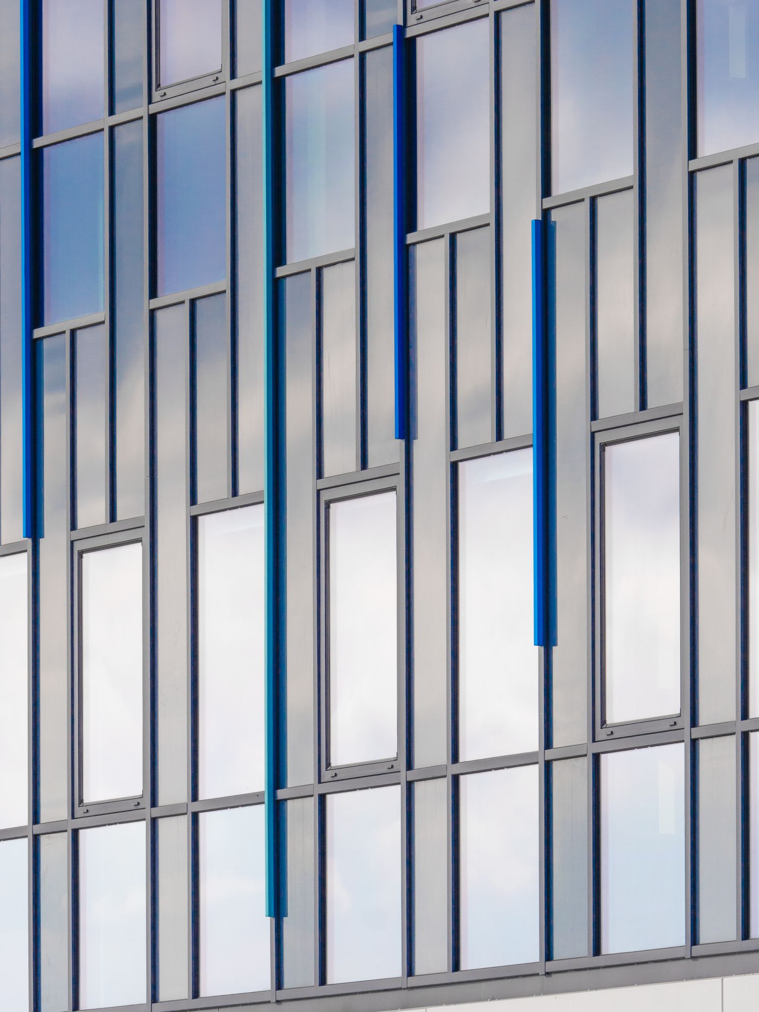 La façade principale en mur rideau, encadrée par le ruban, est soigneusement calepinée avec une alternance d’éléments vitrés et pleins. Un éclairage de mise en valeur aux couleurs d’AIRBUS est déployé sur la façade et bien visible depuis la rocade. L’organisation des espaces lui permet de bénéficier d'espaces extérieurs végétalisés et aménagés.