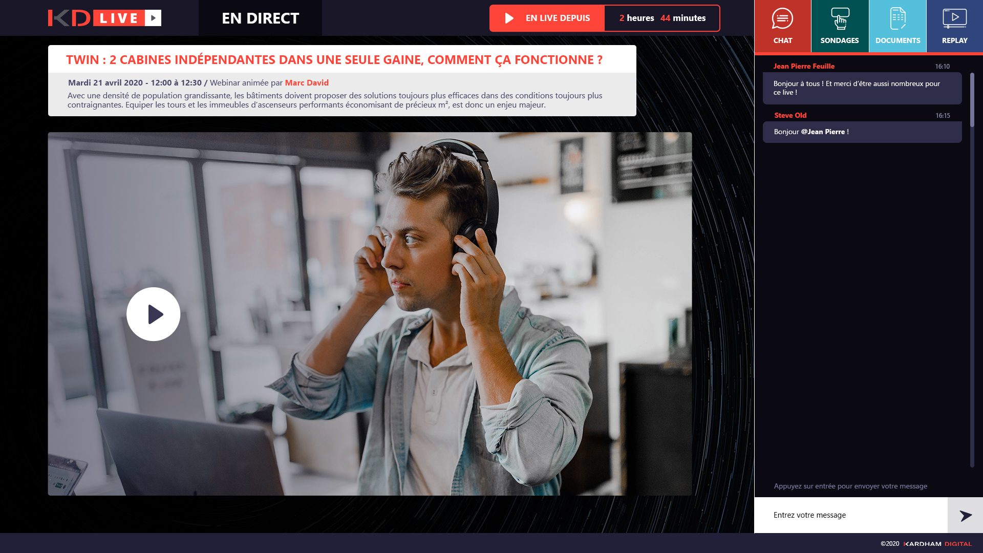 Développée sur-mesure à partir de la plateforme numérique de webinaires et de lives événementiels Kardham Digital Live, la plateforme permet à 2500 utilisateurs de se connecter en simultané.